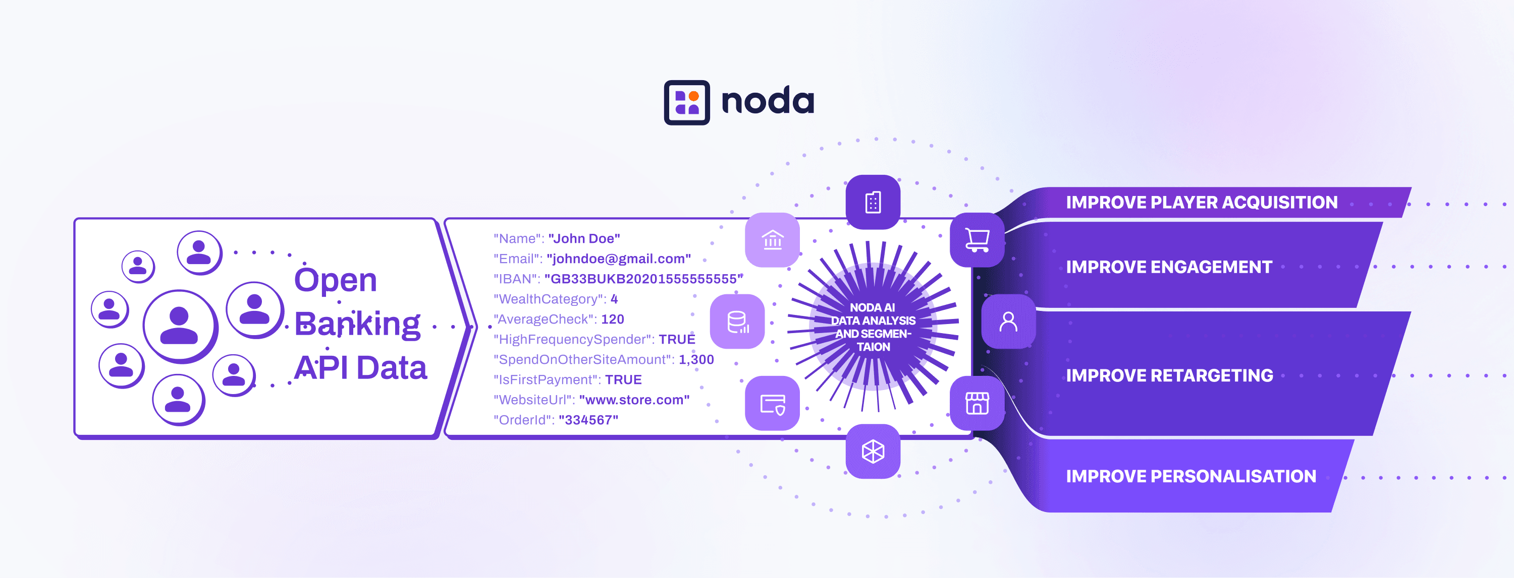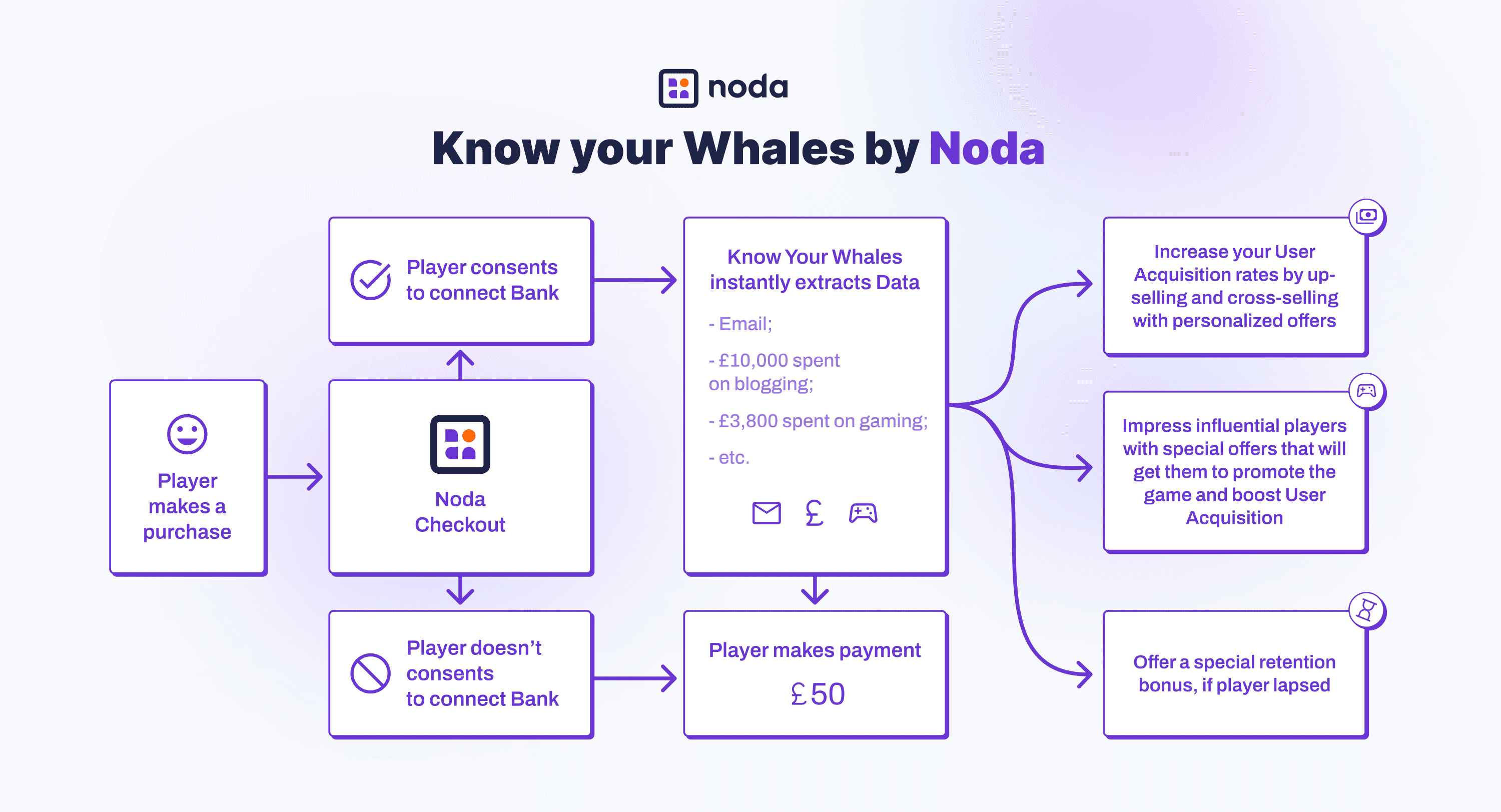 Noda’s Know Your Whales (KYW) tool provides these insights, helping merchants refine marketing strategies and identify clients with high lifetime value (LTV). KYW, however, takes data analytics a step further. It is built on the open banking infrastructure, where traditional banks share data with licensed providers, like Noda, via APIs. When merchants onboard with Noda, they can access KYW user insights as soon as the first transaction has been made.
